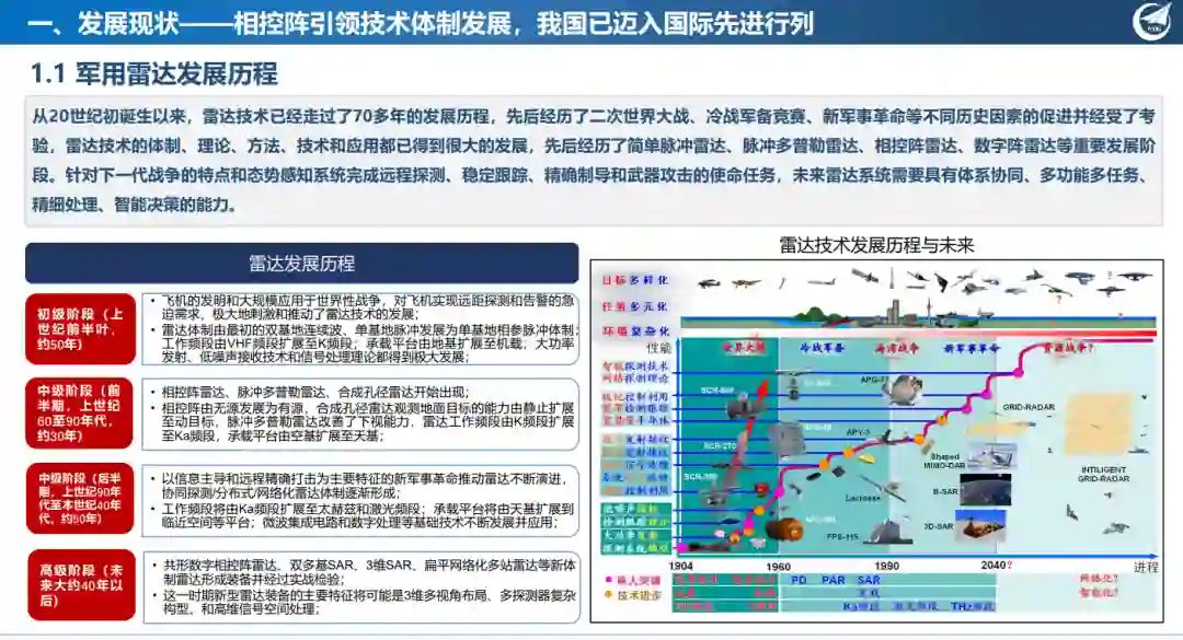 军用雷达的分类有多种方法,常用的主要分类方法有按功能、按技术体制、按工作波长、按承载平台等。军用雷达被称为现代战争的“千里眼”,是当前电子战和信息战的核心装备。当前先进的雷达不仅能够远程探测隐身飞机、弹道导弹、地上兵力、海上编队,还能够精确控制打击武器对目标跟踪制导,以及对重点区域进行连续的侦察监视,获取高清晰战场情报,融入“观察-确认-决策-打击”(OODA)作战流程环的程度越来越深,在信息化联合作战中发挥着举足轻重的作用。军用雷达的重要性主要表现在三个方面:①军用雷达是各级别作战指挥系统中能够实时、主动、全天候获取有关目标战场环境信息的探测手段;②军用雷达是各类先进作战平台不可或缺的组成部分,是实现远程打击、精确打击的必要手段;③军用雷达是评估各类先进武器系统和进行军事技术研究的测试手段。雷达作为战场侦察监视与情报搜索的主要战术装备,是战场态势感知和快速反应的主要技术途径,其性能与效能发挥决定我方力量战场战斗力和生存力。