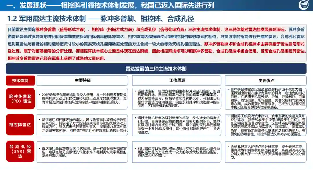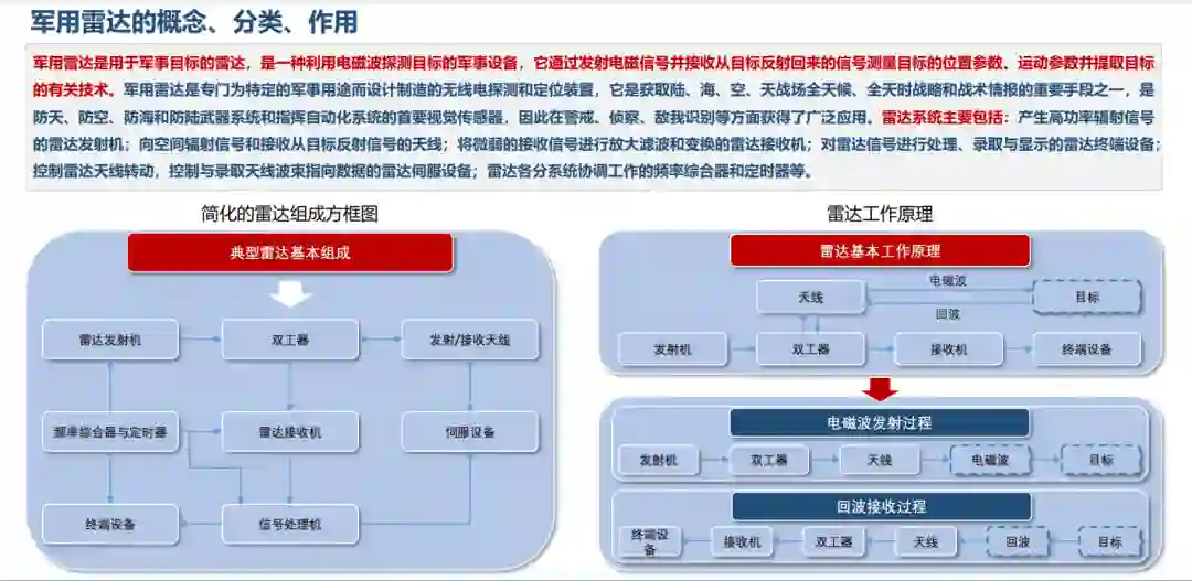 军用雷达是用于军事目标的雷达,是一种利用电磁波探测目标的军事设备,它通过发射电磁信号并接收从目标反射回来的信号测量目标的位置参数、运动参数并提取目标的有关技术。军用雷达是专门为特定的军事用途而设计制造的无线电探测和定位装置,它是获取陆、海、空、天战场全天候、全天时战略和战术情报的重要手段之一,是防天、防空、防海和防陆武器系统和指挥自动化系统的首要视觉传感器,因此在警戒、侦察、敌我识别等方面获得了广泛应用。雷达系统主要包括:产生高功率辐射信号的雷达发射机;向空间辐射信号和接收从目标反射信号的天线;将微弱的接收信号进行放大滤波和变换的雷达接收机;对雷达信号进行处理、录取与显示的雷达终端设备;控制雷达天线转动,控制与录取天线波束指向数据的雷达伺服设备;雷达各分系统协调工作的频率综合器和定时器等。