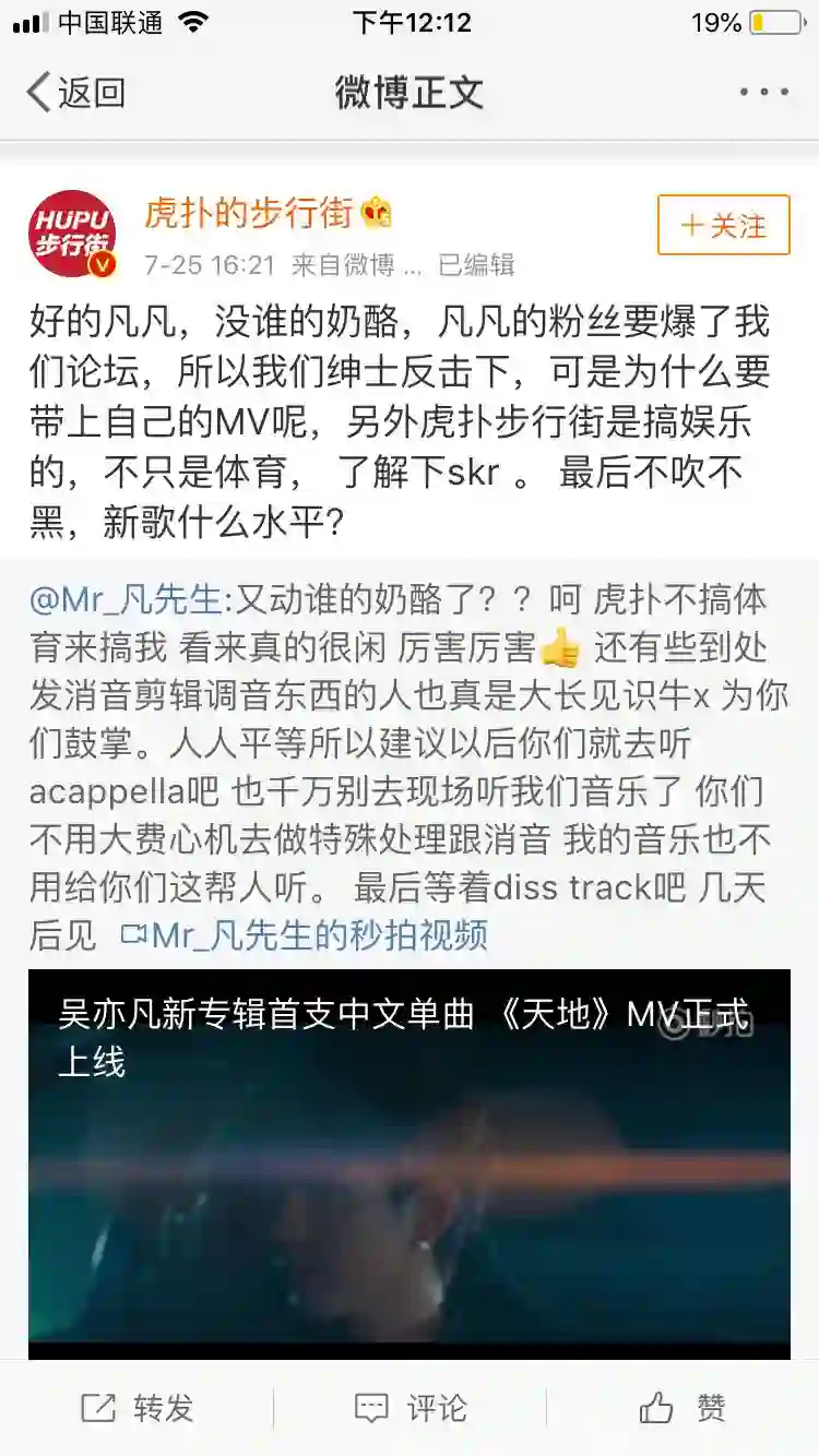 十分钟后,虎扑步行街的官微转发吴亦凡的微博,正面刚。