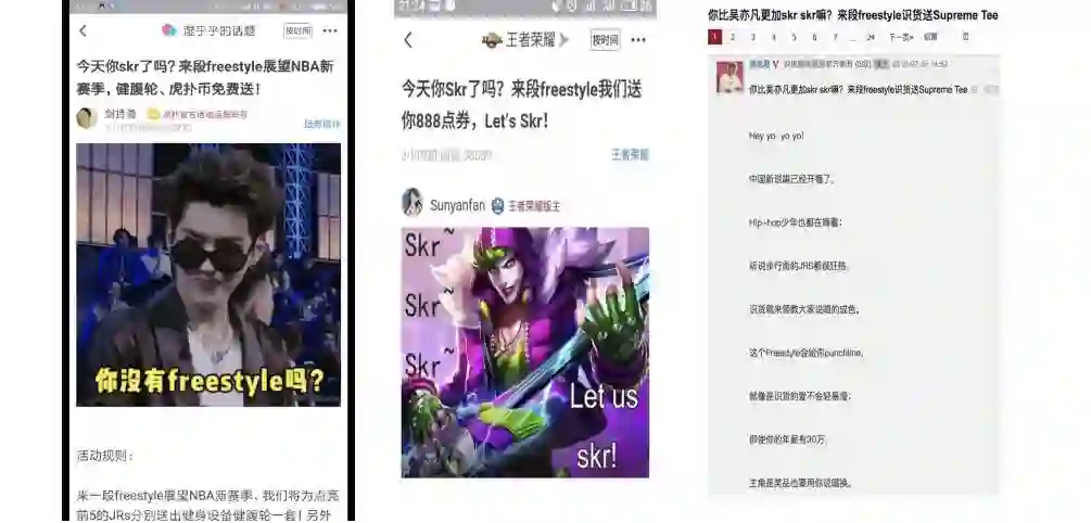 虎扑社区内的官方运营账号,在话题下迅速展开了创作大赛。题目为“今天你skr了吗来段freestyle战网NBA新赛季,健腹轮、虎扑币免费送”