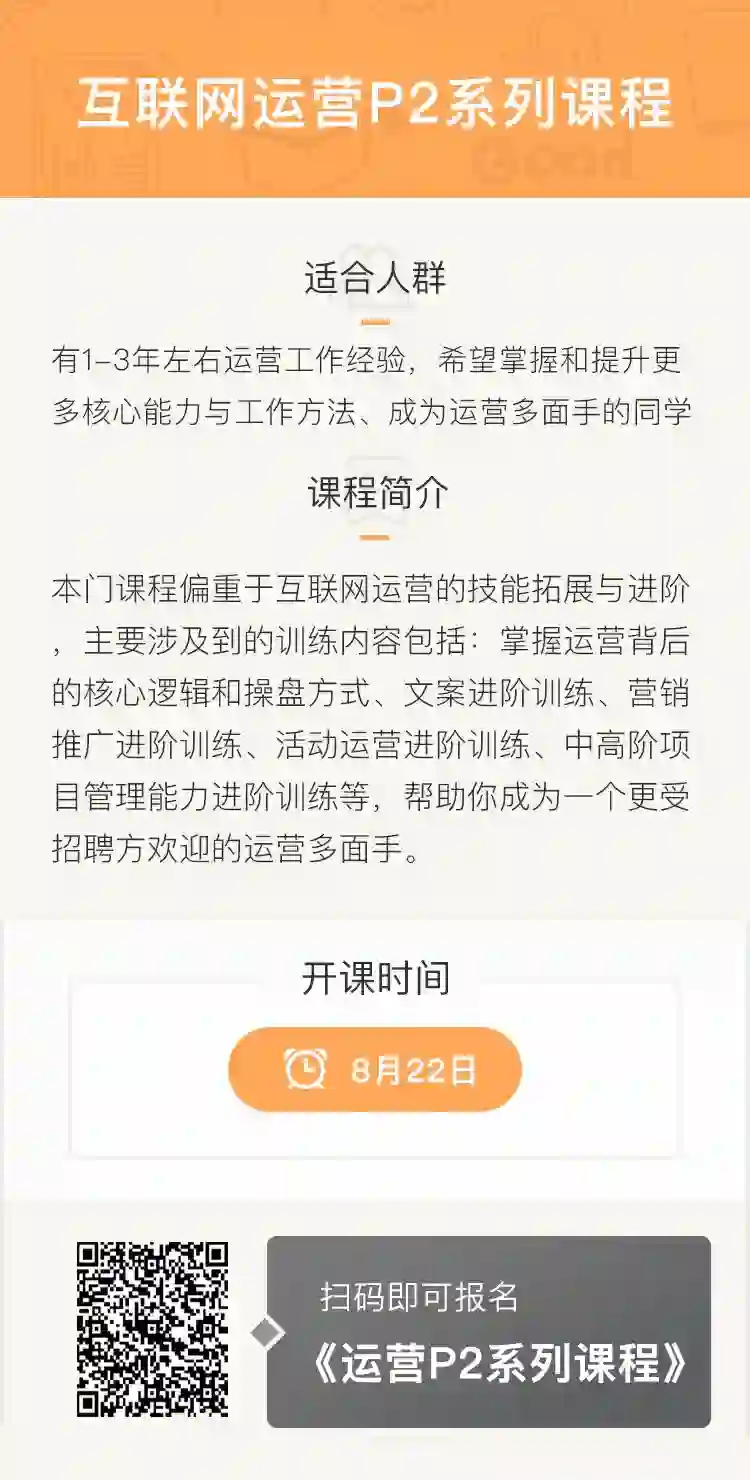 本期运营P2即将于8月22日开课,目前采用阶梯定价的方式报名,原价1699元,限额福利价1549元,名额仅剩最后30余个,想要报名的同学,赶快扫描下方海报中的二维码,前去抢占最后的优惠名额啦!