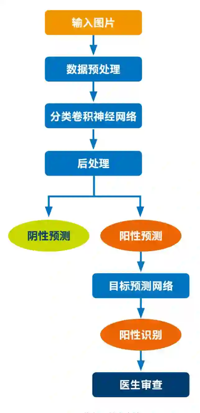 江丰生物联合英特尔构建的基于宫颈 LBP 切片的宫颈癌筛查 AI 解决方案,主要工作流程如下图所示,系统在输入图片后,经由数据预处理、分类卷积神经网络和后处理阶段,分别得到阳性预测和阴性预测。对于阳性预测,方案则进行第二阶段的目标侦测网络(基于 Resnet50)模型的训练,然后进行阳性识别的推理过程,并交由医生做最终审查。