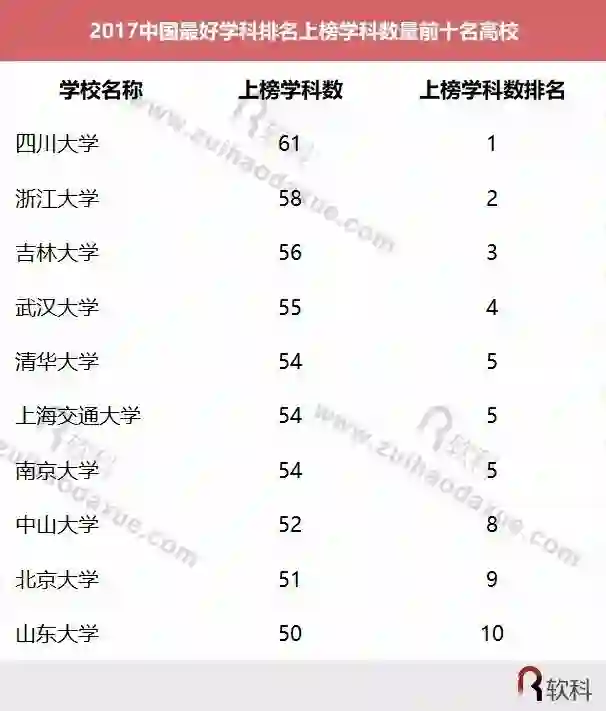 在中国最好学科排名中,各个学科排名的对象是在该学科设有博士、硕士学位授权点的所有高校,发布的是在该学科排名前50%的高校。按照上榜次数统计,四川大学有61个学科上榜,领先国内其它高校。浙江大学、吉林大学、武汉大学、清华大学、上海交通大学、南京大学、中山大学、北京大学、山东大学的上榜学科数也都达到50个或更多。