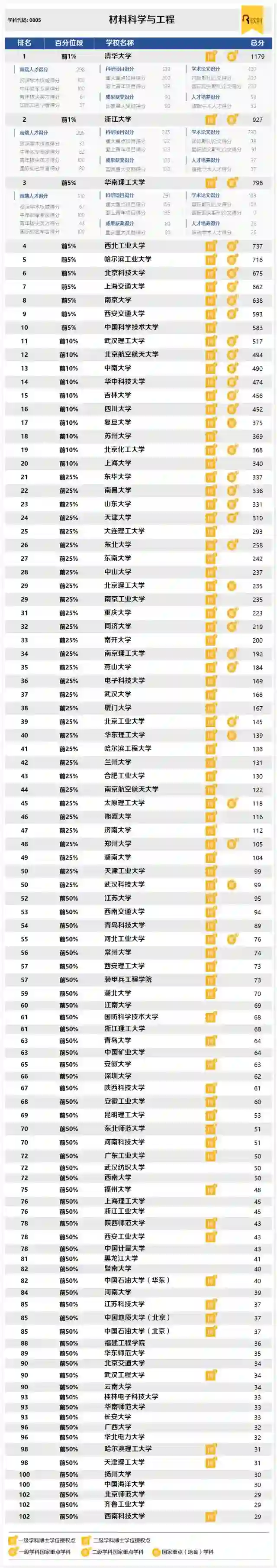 如下是材料科学与工程学科排名情况。清华大学、浙江大学、华南理工大学位列前三,北京科技大学排名第六。