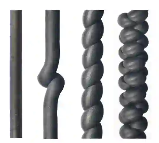 图1“扭热制冷”中,对橡胶纤维加捻会生成不同的结构:加捻、部分螺旋、全部螺旋、和超螺旋,橡胶直径:2.5 mm,预拉伸应变:200%。
