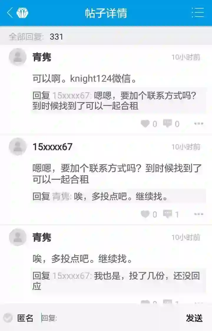 论坛的主要作用是用户之间的交流,主要内容包括经验交流、求助、合租信息、对实习僧产品的疑问等等。用户可以选择匿名发帖和回复,实名情况下也只能看到头像、昵称、签名和学校,且无法进入其主页,无太多社交性质。