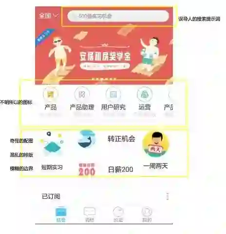 图标诡异和边界不明的“职位筛选词”与“特殊实习筛选词”:如下图可以看到,“产品”、“产品助理”、“用户研究”、“运营”等上面的图标十分诡异,看起来和岗位并无关系,反而造成注意力的分散;“短期实习”、“转正机会”所配图标也十分奇怪。另外,“特殊实习”筛选词的排版较不统一,再加上边界不清,看起来十分混乱。