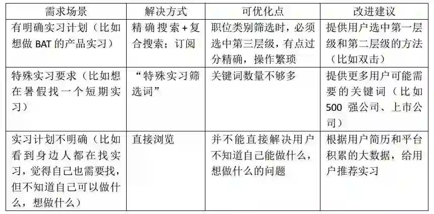 从逻辑上来看:实习僧通过多种方式服务需求不同的用户,根据上面的分析结果,实习僧认为用户一共存在以下3种需求场景: