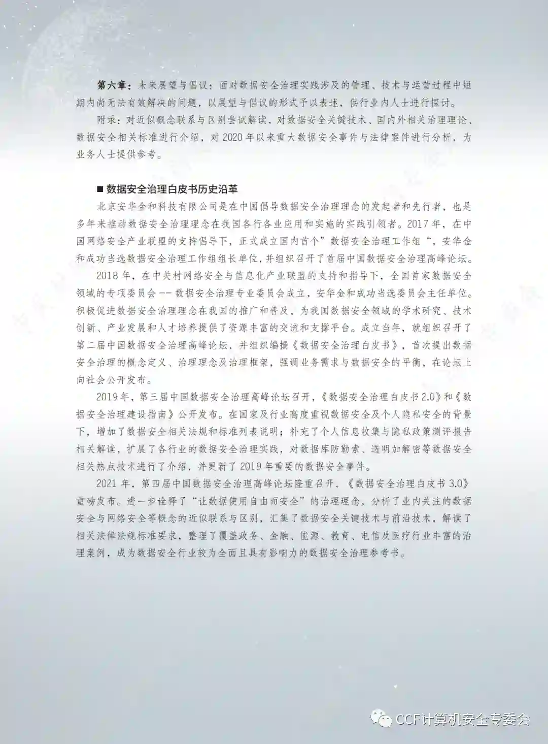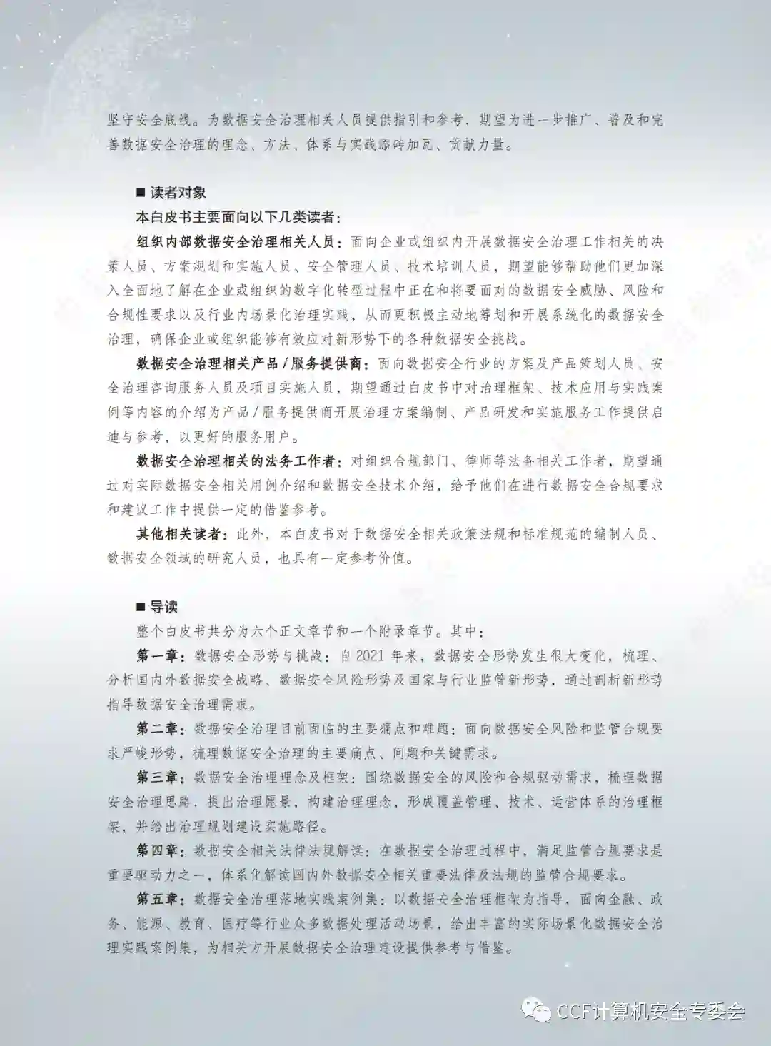 《数据安全治理白皮书1.0》是由中关村网络安全与信息化产业联盟数据安全治理专委会的成员单位们于2018年5月第二届中国数据安全治理高峰论坛上正式发布,也是国内首个关于数据安全治理概念、理论和技术介绍的普及类技术文档;2019年到2021年,白皮书2.0、3.0版本相继发布,整理并收录更多前沿的理论、技术、案例等内容,解读相关法律法规标准要求,推广与宣传数据安全体系化建设、持续改善的建设思路,使数据安全治理逐步成为数据安全建设的共识,《数据安全治理白皮书》也成为数据安全行业较为全面且具有影响力的数据安全治理参考书。