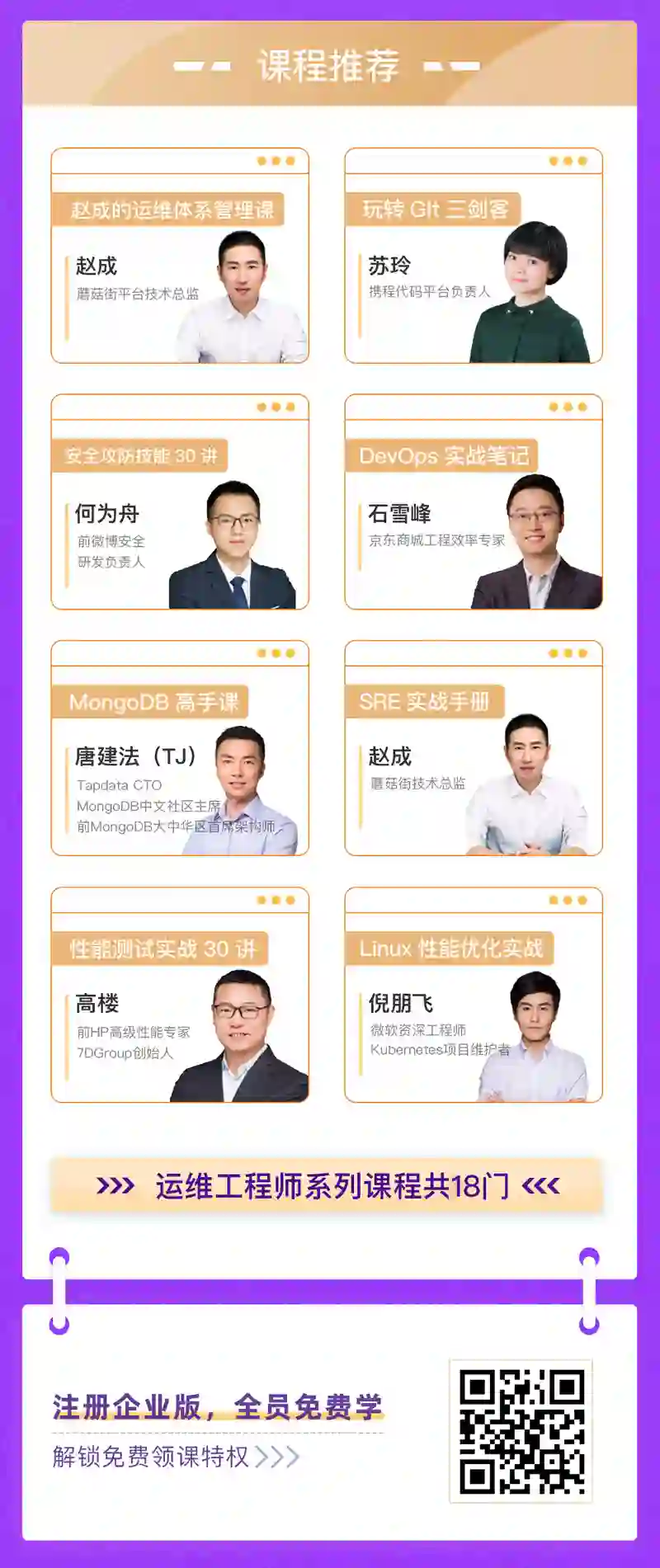 除上述运维系列课程外,企业(研发团队)开通极客时间企业版账号,全员可免费学前端、后端、架构、测试、大数据、云、分布式等各领域课程。👇