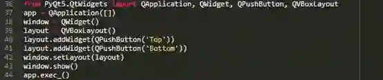 和通常一样,我们先实例化一个QApplication。然后,我们创建一个窗口。我们使用最基本的QWidget ,因为它仅仅是充当一个容器,我们不希望它有任何特殊的行为。接下来,我们创建布局并向其添加两个QPushButtons。最后,我们告诉窗口使用这个布局(及其内容)。在我们的第一个应用程序中,我们结束了对.show()和app.exec_()的调用。