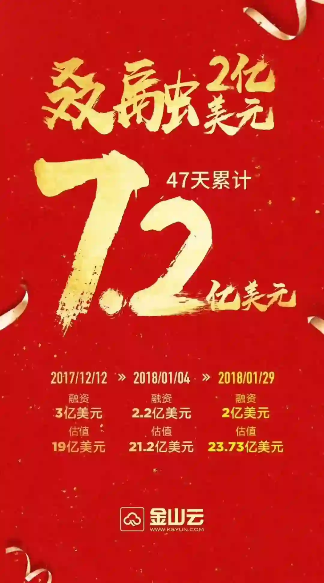 47 天内累计融资 7.2 亿美元,没错,这就是金山云的成绩。1 月 29 日,雷军旗下公司金山云宣布完成新一轮 2 亿美元融资,至此金山云 D 轮融资金额已达 7.2 亿美元。投后估值达 23.73 亿美元,刷新了中国云行业融资额和估值最高纪录。