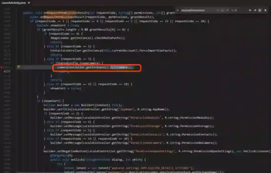 Telegram 的情况具体来说是首次打开 Telegram 对话界面前摄会自动开启,之后不会再悄悄启动。为了解摄像头升起过程,DT 君在我司程序员小哥哥帮助下,尝试理解 Telegram 的程序,下图中红框标出来的部分命令是指,初始化摄像头,即让摄像头做好准备为之后使用。而据介绍,在 App 请求初始化过程时,vivo 手机控制前置摄像头升起。