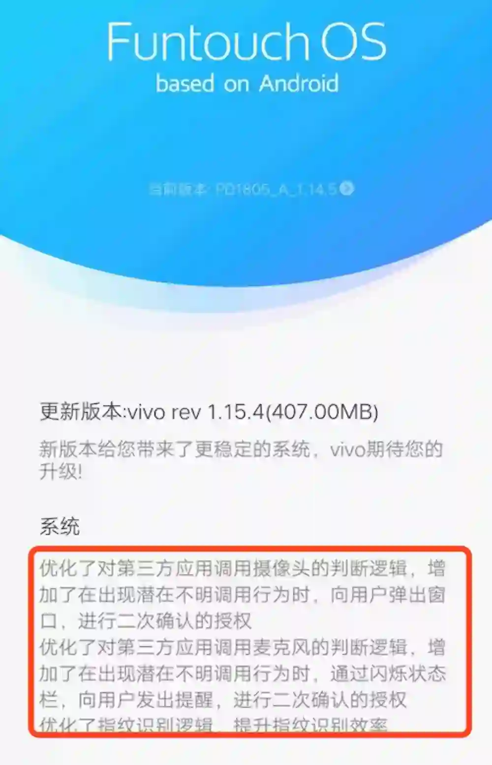 尽管如此,vivo NEX 迅速反应,在周五发布系统更新。新版本优化了第三方应用调用摄像头的判断逻辑,将在出现不明调用行为时通过弹窗向用户请求授权;在第三方应用调用麦克风方面,新系统也进行优化,将在出现不明调用时通过闪烁状态栏提醒用户。