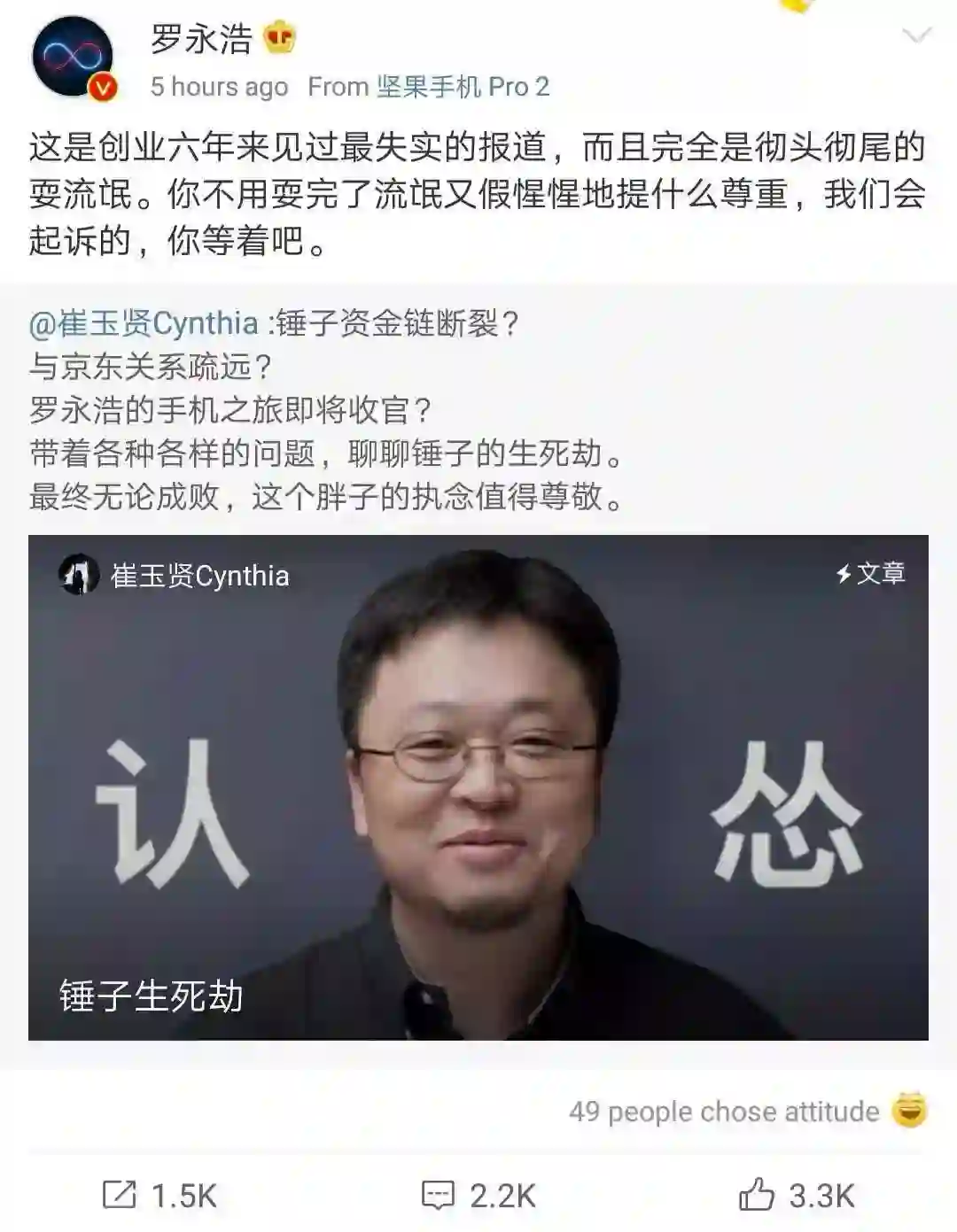 对此,罗永浩发布微博称:“这是创业六年来见过最失实的报道”,并表示“会起诉的”。