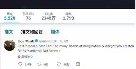 马斯克发推文缅怀,他表示,斯坦·李为人类所创作的想象和快乐的世界将永远存在。