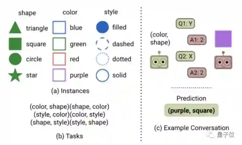 Task & Talk游戏是这样的:有一个虚拟的世界,其中的物体有4种可能的形状、4种可能的颜色、以及4种可能的样式。负责回答问题的A-BOT拿到一个物体,然后Q-BOT的任务是通过向A-BOT提问来搞清楚物体的一对属性。