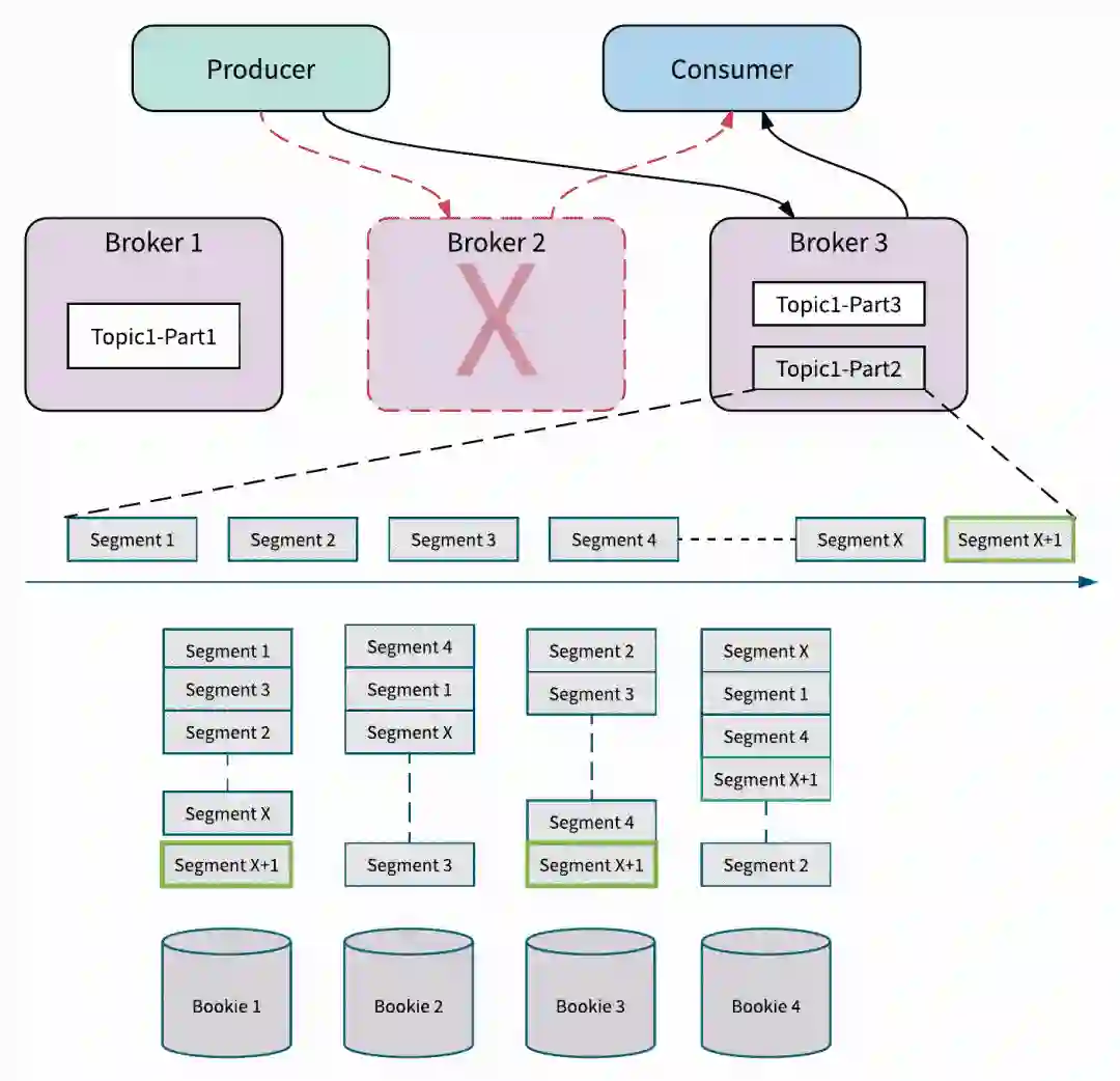即使有 Bookie 节点出错的情况发生时,通过添加新的可用的 Bookie 来替换失败的 Bookie,所有 Broker 都可以继续接受写入,而不会牺牲主题分区的可用性。