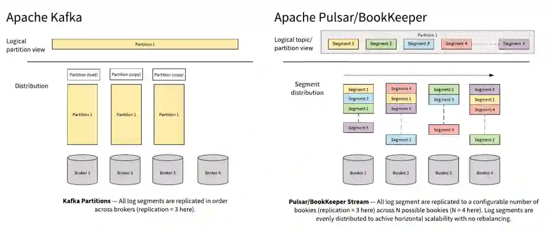 相反,在 Apache Pulsar 中,同样是以分区为逻辑单元,但是以 Segment 为物理存储单元。分区随着时间的推移会进行分段,并在整个集群中均衡分布,旨在有效地迅速地扩展。