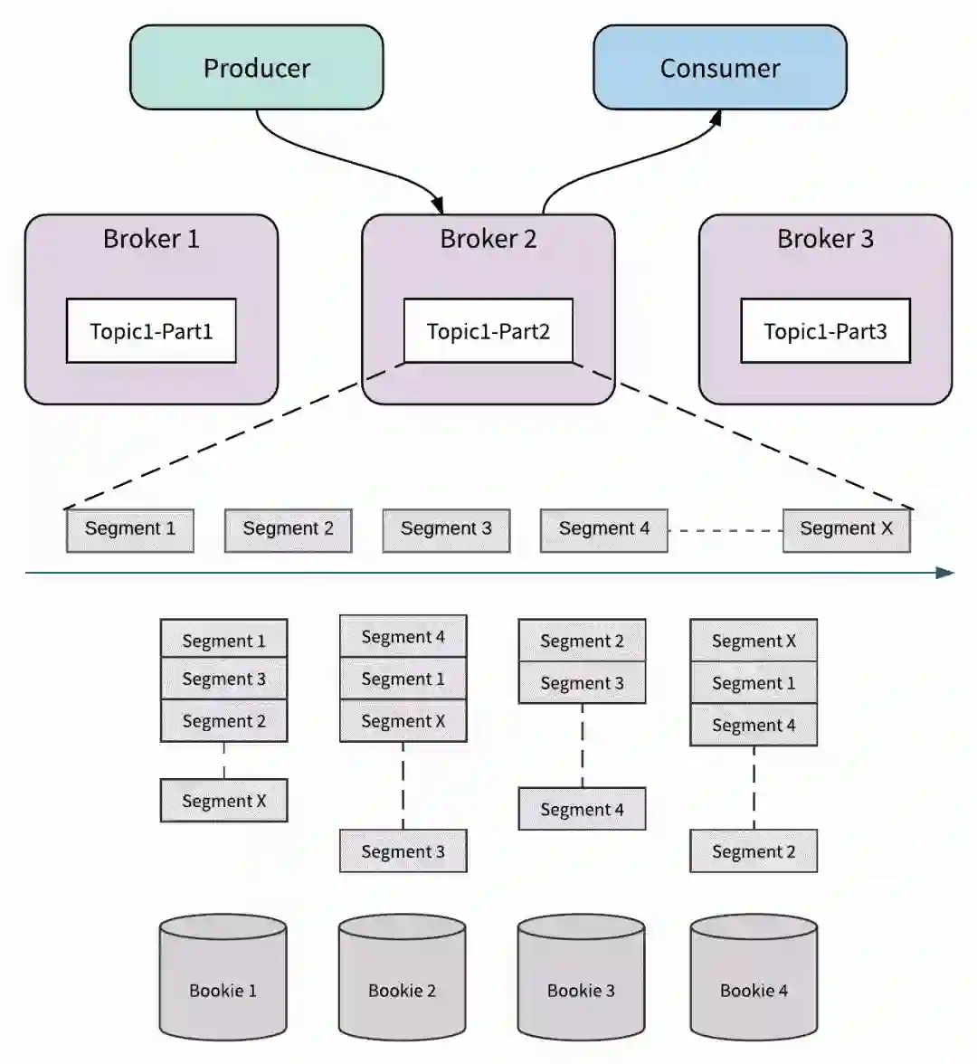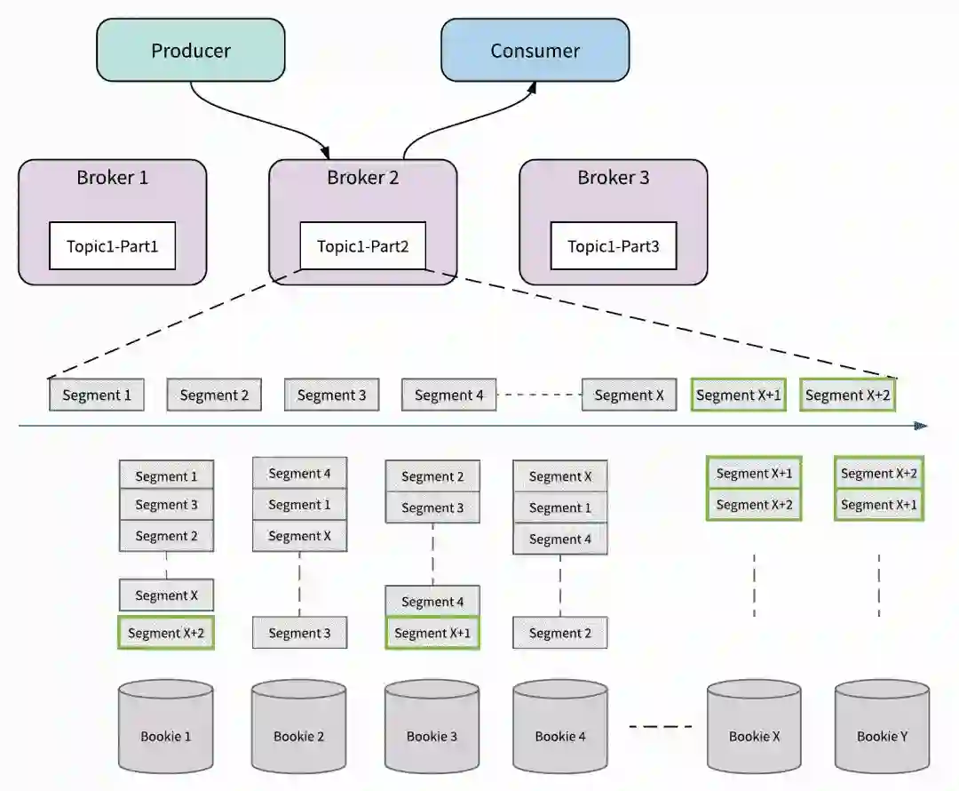 通过 Segment 分段的方式,主题分区中的消息可以均匀和平衡地分布在群集中的所有 Bookie 中。 这意味着主题分区的大小不仅受一个节点容量的限制; 相反,它可以扩展到整个 BookKeeper 集群的总容量。