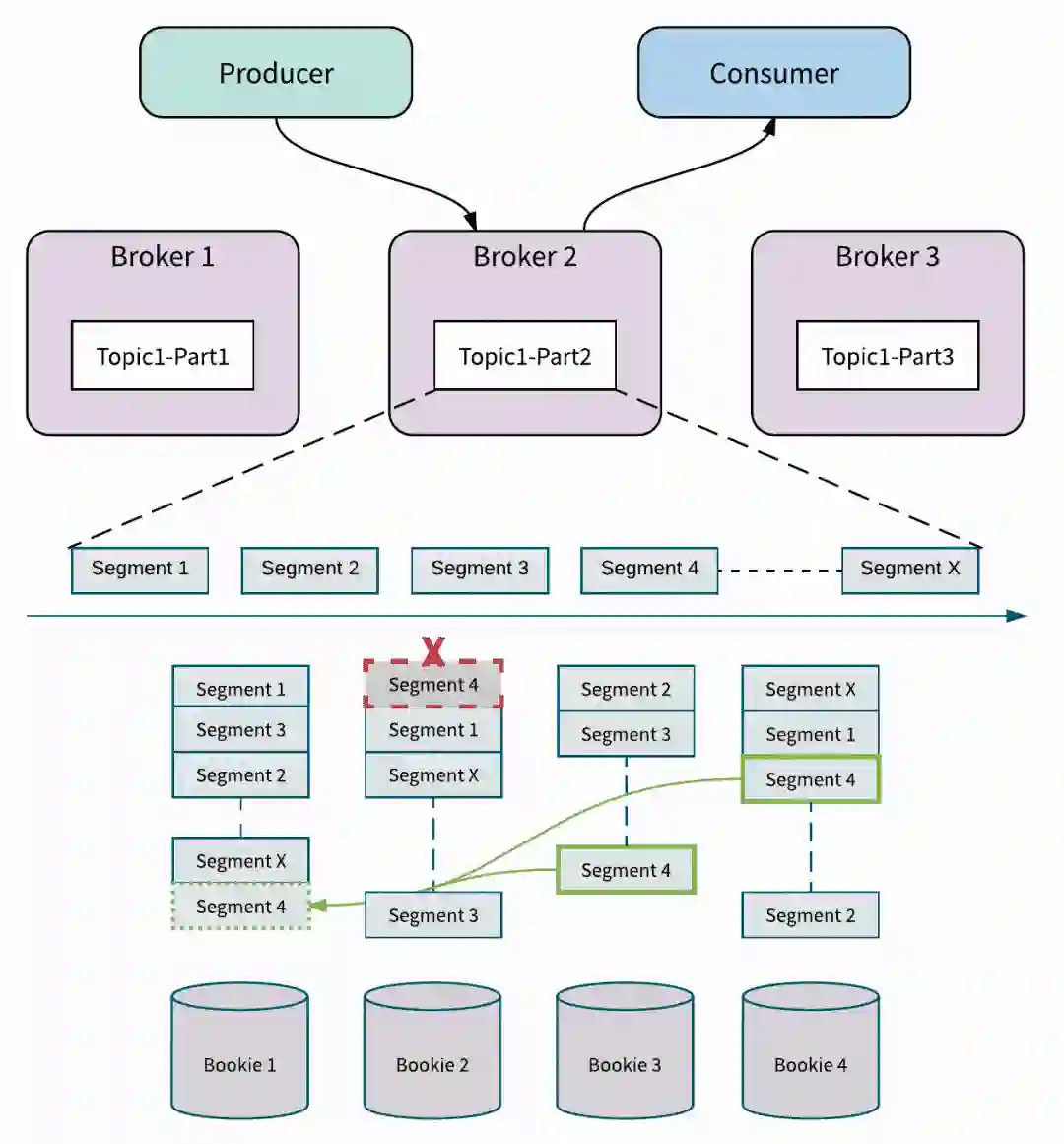 Apache BookKeeper 中的副本修复是 Segment(甚至是 Entry)级别的多对多快速修复,这比重新复制整个主题分区要精细,只会复制必须的数据。 这意味着 Apache BookKeeper 可以从 bookie 3 和 bookie 4 读取 Segment 4 中的消息,并在 bookie 1 处修复 Segment 4。所有的副本修复都在后台进行,对 Broker 和应用透明。