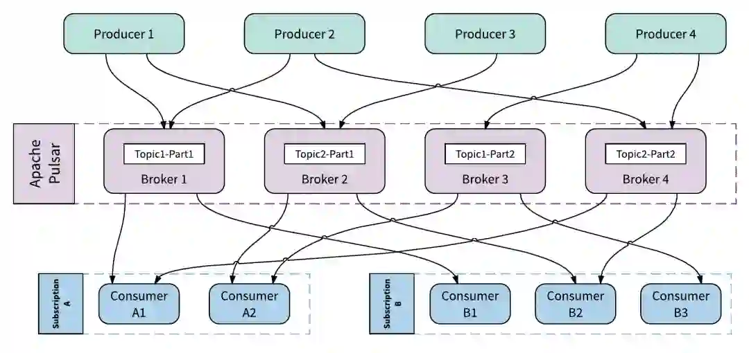 对同一主题的不同订阅,也可以采用不同的订阅类型。比如用户可以在同一主题上可以提供一个包含 3 个消费者的故障切换订阅,同时也提供一个包含 20 个消费者的共享订阅,并且可以在不改变分区数量的情况下,向共享订阅添加更多的消费者。
