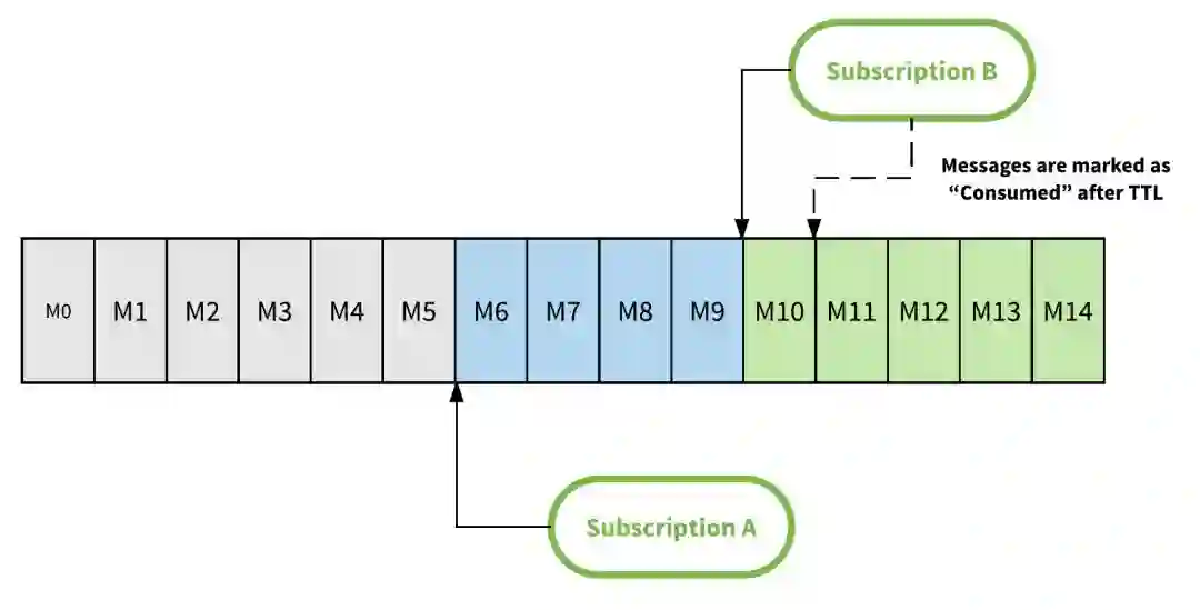 下图说明了如何在有 2 个订阅的主题中保留消息。订阅 A 在 M6 和订阅 B 已经消耗了 M10 之前的所有消息之前已经消耗了所有消息。这意味着 M6 之前的所有消息(灰色框中)都可以安全删除。订阅 A 仍未使用 M6 和 M9 之间的消息,无法删除它们。如果主题配置了消息保留期,则消息 M0 到 M5 将在配置的时间段内保持不变,即使 A 和 B 已经确认消费了它们。
