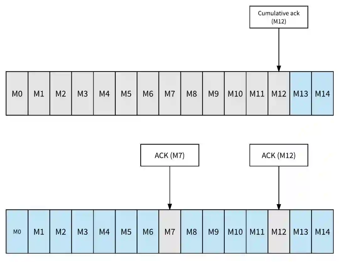 Apache Pulsar 可以支持消息的单条确认,也就是选择性确认。消费者可以单独确认一条消息。 被确认后的消息将不会被重新传递。下图说明了单条确认和累积确认的差异(灰色框中的消息被确认并且不会被重新传递)。在图的上半部分,它显示了累计确认的一个例子,M12 之前的消息被标记为 acked。在图的下半部分,它显示了单独进行 acking 的示例。仅确认消息 M7 和 M12 - 在消费者失败的情况下,除了 M7 和 M12 之外,其他所有消息将被重新传送。