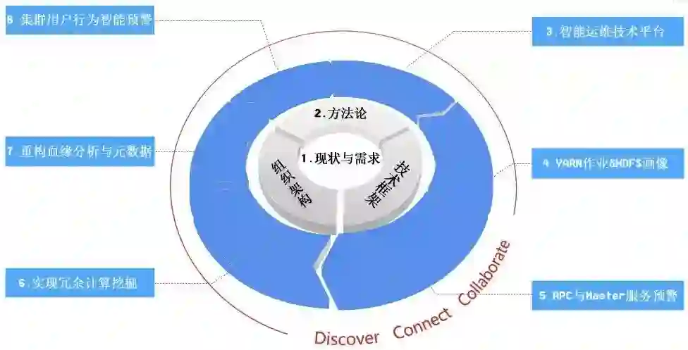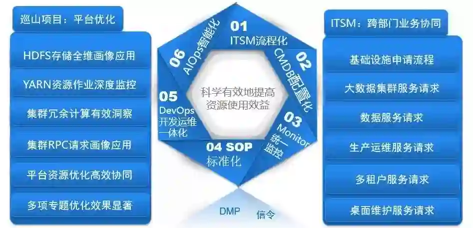 以底层技术为核心,从资源、存储、计算三大维度进行联合治理,深度监控各业务资源队列使用状态、存储系统文件分布、作业运行事件和配置,建立可视化工具体系,驱动日常优化和运营。