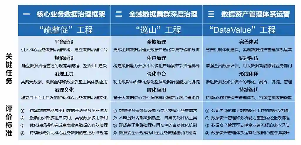 回到你刚才的提问,数据治理基本上可以理解为工程一的核心目标;大规模集群的治理对应工程二,它需要长期支撑工程一的具体建设任务,并为数据资产管理体系的运营夯实基础。