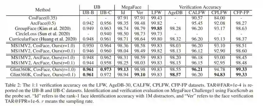 我们在内部的业务和FRVT竞赛上都验证了这个方法,再学术界的测试集IJBC和Megaface上,使用Glint360K的Full softmax和10%采样会有着相当的结果。