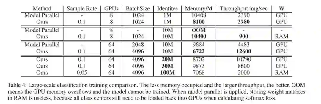 个正类中心随机分布再所有的GPU中,我们让每个正类中心所属的GPU将该正类采样出来即可,每张GPU正类采出来后,再随机用负类补齐到约定的采样率,这样是的每张GPU采样的到的类中心都是一样多的,实现负载均衡。后续的过程就就是分类层的模型并行部分了,需要注意的是,只有采样出来的类中心的权重和动量会更新。