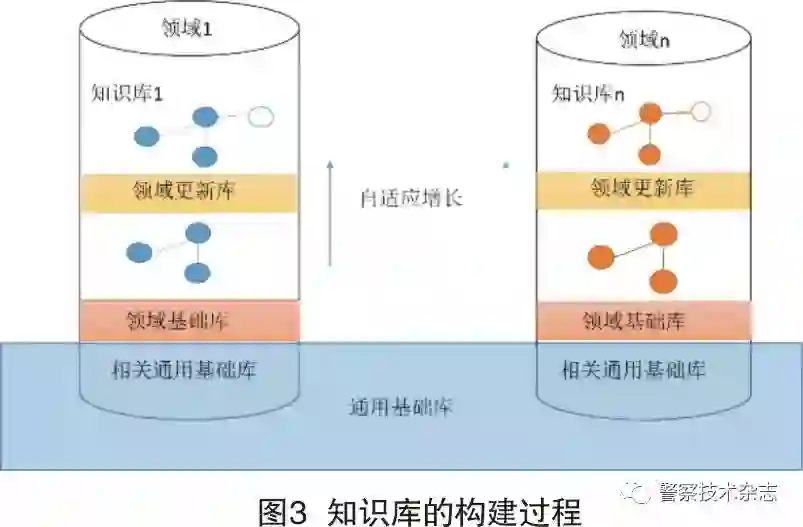 如图3所示,进一步描述了知识库的构建过程。知识获取的主要目的是融合通用知识基础库与领域专业基础库,抽取其中的概念、实例、属性和关系。通用基础库是指从常识知识中选取和领域相关知识构成的知识库。领域基础库是用来描述领域相关的其他基本知识,如便民服务更关注的证件办理、安保巡逻更关注的安全常识,其来源于专业领域字典、核心词汇表等。其次,为了获取当前最新最实时的领域知识,建立领域更新库,不断更新和完善知识库内容。