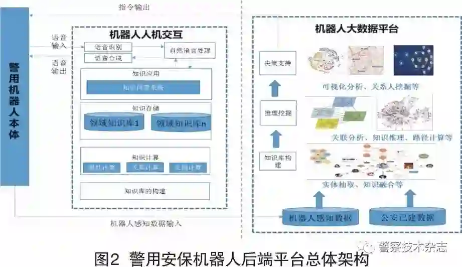 包含了知识库构建、推理挖掘和决策支持。将机器人感知数据与公安大数据进行深度融合,形成公安情报分析知识库,利用关联分析等算法,实现可视化分析、关系人挖掘等上层应用,并将分析结果反馈到机器人本体,指导本体下一步工作。