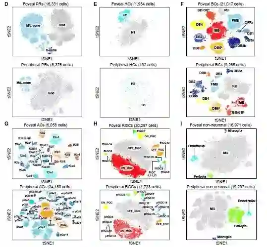 最终,他们在中央凹和外周视网膜中均鉴定出了近70种不同类型的细胞,并且还知道了每一个类型的细胞表达哪些基因。