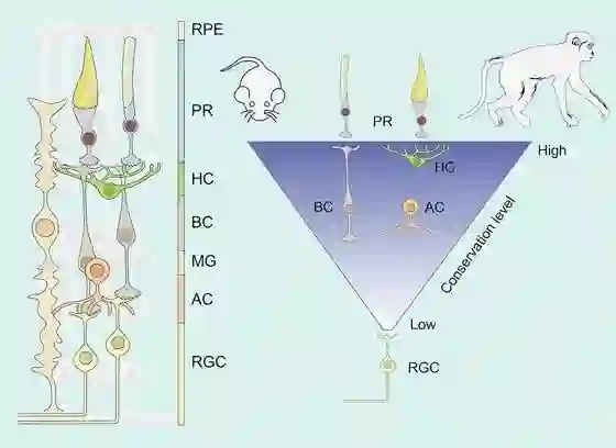 ▲在小鼠和食蟹猴之间,视网膜中相比其他类型的细胞,负责向大脑传递信号的神经细胞差别尤其大(图片来源:参考资料[1])