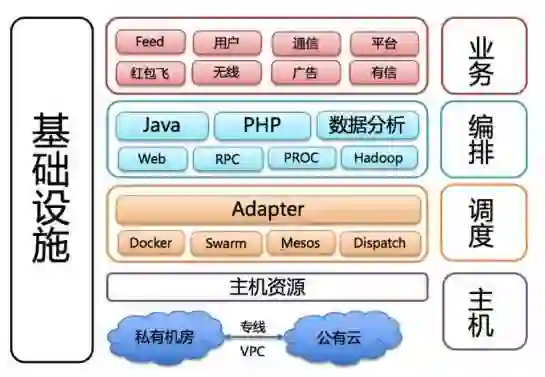 DCP 平台,主要包含 4 层架构:主机层、调度层及业务编排层,最上层则是各业务方系统。底层的混合云基础架构则架 Dispatch 设了专线,打通微博内部私有云以及阿里云。