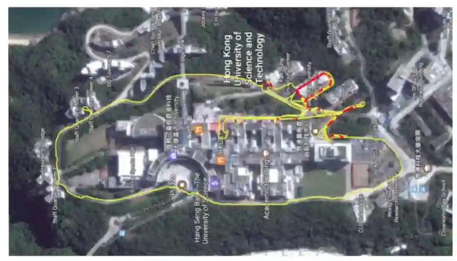 图4 在大规模环境中的估计轨迹示意图,与谷歌地图对齐。其中黄线表示基于VINS-Mono算法的估计轨迹,红线表示闭环。