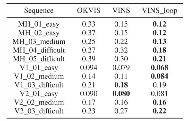表1总结了OKVIS,VINS不带回环检测以及VINS带回环检测三种方法在EuRoC数据集下15个数据子集的结果。