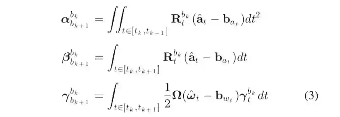 对于相机和IMU采集到的数据需要进行预处理。对于视觉数据,需要在相邻两帧中跟踪特征并且在最新帧中检测特征;对于IMU数据,需要对相邻两帧中的IMU数据进行预积分。