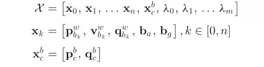 其中,x_k表示拍第k帧图像时的IMU状态,包括位置、速度、世界坐标系下的IMU方向以及IMU坐标系下的加速度计和陀螺仪的偏移。n表示关键帧的数目,m表示滑动窗口中的特征总数。λ_l是第l个特征的逆深度。x^b_c表示相机在IMU坐标系下的位姿。