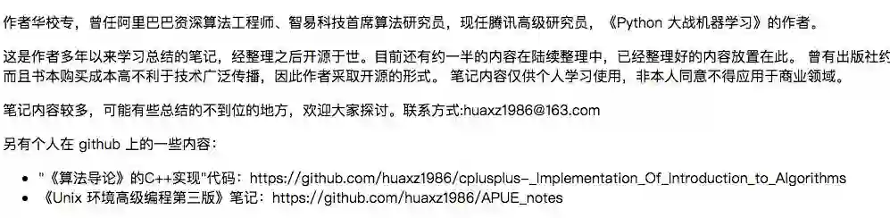 推荐一个开源项目:AI算法工程师手册,作者华校专,曾任阿里巴巴资深算法工程师、智易科技首席算法研究员,现任腾讯高级研究员,《Python 大战机器学习》的作者。