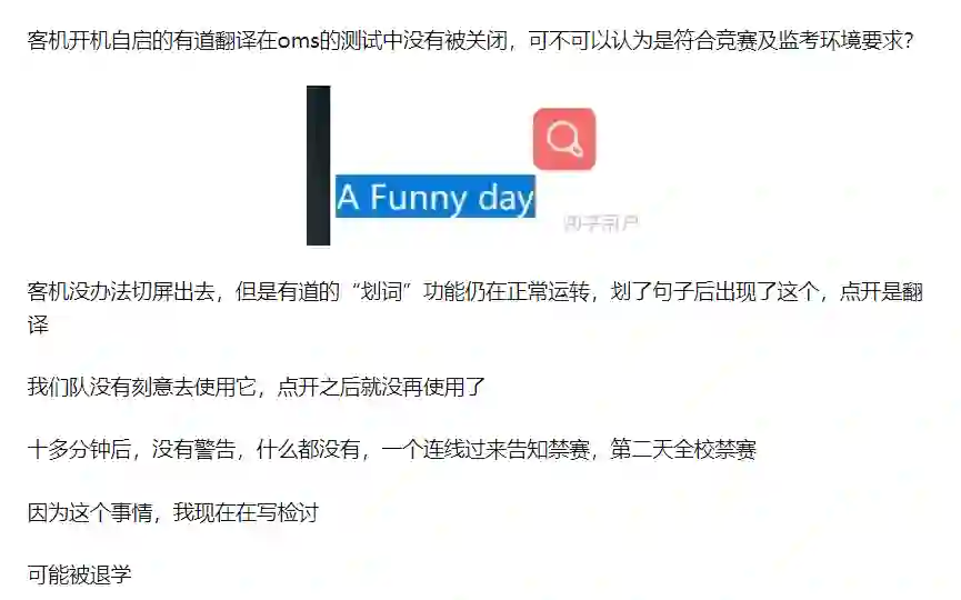 另有参赛者表示,客机上的有道翻译是自动开启的,自己没有使用,却被通知禁赛,甚至自己有可能被退学。