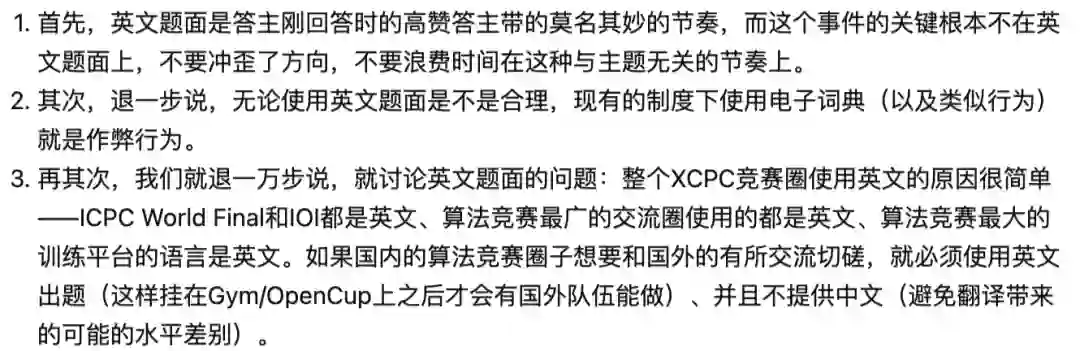 答主「Chris」指出,在现有制度下,使用电子词典或者类似的行为,就是作弊。而「英文题面」并不是现在讨论的重点。