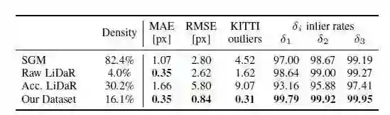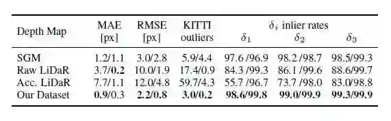 (2)在均方根误差(RMSE)、KITTI离群值以及最大平均相对误差方面,本文提出的数据集胜过所有的基准结果。
