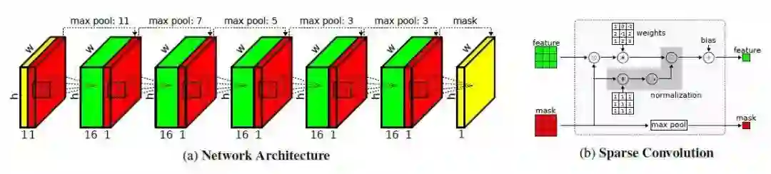 1、本文提出了一个简单而有效的稀疏卷积层,它在卷积运算中明确地考虑了缺失数据的位置,根据输入像素的有效性对卷积核的元素进行加权。