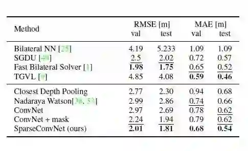 本文研究输入稀疏情况下的卷积神经网络,并将其应用于稀疏激光扫描数据的深度信息补全。首先,传统的卷积网络在应用于稀疏数据时表现较差,即使向网络提供缺失数据的位置时也是如此。为了克服这个问题,本文提出了一个简单而有效的稀疏卷积层,它在卷积运算中明确地考虑了缺失数据的位置。在合成与真实数据实验中,与各种基准方法的对比结果显示了所提出的网络体系结构的优点。与稠密基准相比,本文提出的稀疏卷积网络可以很好地推广到新的数据集中,并且不会因为输入数据的稀疏程度而影响网络输出结果的好坏。为了进行评估,本文从KITTI基准测试中推导出一个新的数据集,包含93k经过深度标注的图像。本文的数据集允许在具有挑战性的实际环境中进行深度信息补全和深度预测方法的训练和评估。