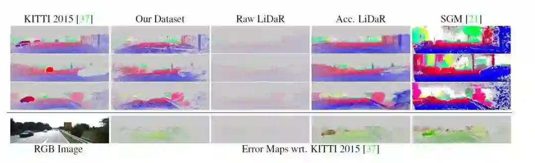 在本文提出的数据集中只发现很少的错误。大多数剩余的错误位于动态对象或远距离。相比之下,SGM结果在远距离处是不准确的,并且激光雷达扫描导致由于激光雷达传感器和用于投影的虚拟相机(我们在所有实验中使用KITTI参考相机的图像平面)的不同放置而导致的遮挡误差。如图2所示,可以注意一些动态目标(例如,左侧的汽车)会在累积的激光雷达扫描中导致很明显的误差,而这些误差在我们的技术中可以大大减少。