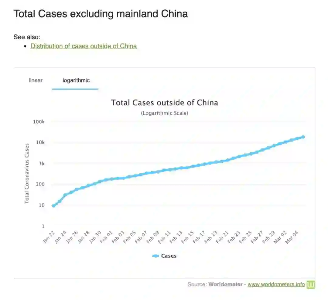 中国大陆以外的 COVID-19 病例数增长和指数函数如此接近,几乎呈现出完美的指数增长形态。