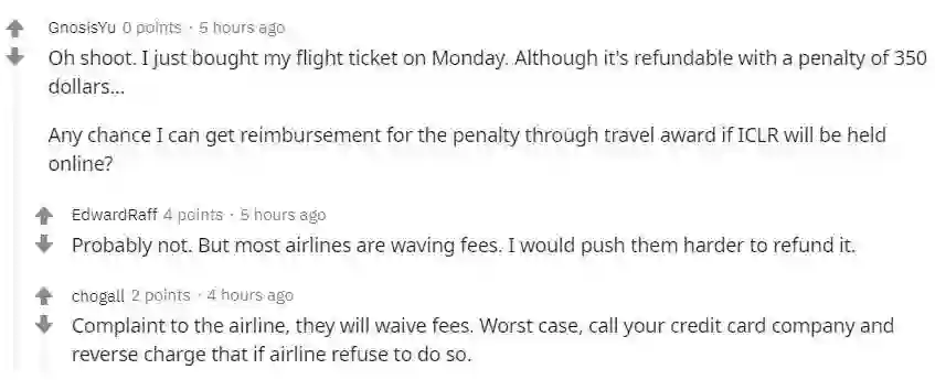 距离原定的开幕日期只有不到两个月时间,很多人已经订好了往返亚的斯亚贝巴的机票,ICLR 2020 即将改为线上的消息一出,立即引发了人们的迅速关注。国际航班的机票可不会像春节期间国内的一样无条件全额退款: